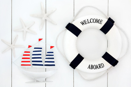 Abstract of seaside decorative sailing boat, lifebuoy and starfish over wooden white background.