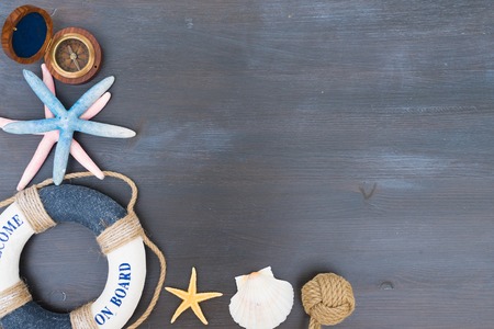 Nautical and summer background top view on wooden background