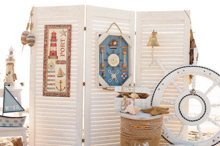 interior in maritime style: sofa, box, helm, anchor and life preserver
