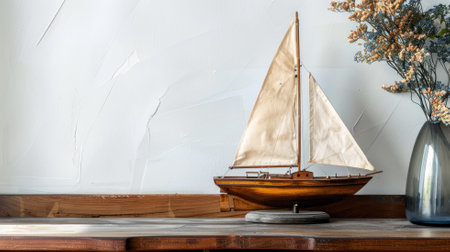 Model sailboat beside vase with dried flowers on wooden shelf against textured white wall