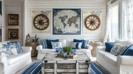 This cozy living room features white sofas adorned with blue and white pillows. Nautical decor including ship wheels and vintage maps evoke a maritime vibe, creating a serene atmosphere.