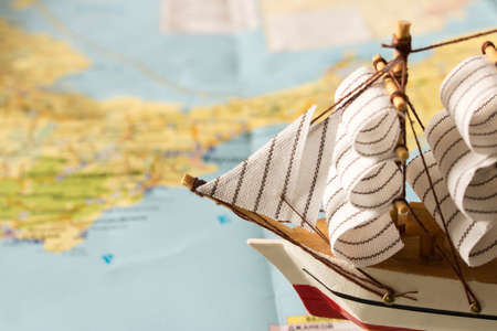 Model sailboat on the background of the map. Travel concept.