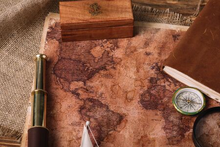 wooden box, telescope, compass and aged world map on hessian