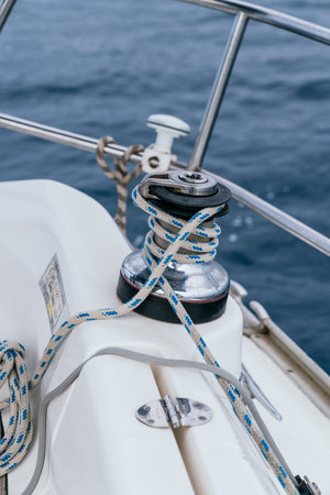 winch and nautical ropes on a sailing boat in the port