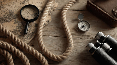 A collection of vintage exploration tools including a compass, magnifying glass, binoculars, and rope on a rustic wooden surface.