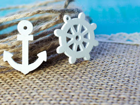 nautical decor with a helm and an anchor, on a white texture, surface, space, travel, vacation.