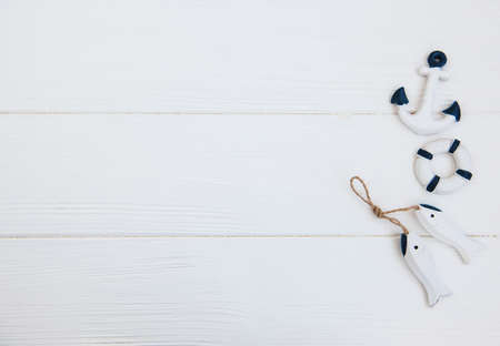 Background with decorative anchors and wheels on a white painted background. Place for text. Top view with copy space.
