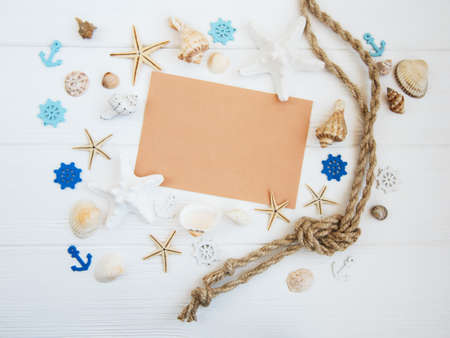 Holiday beach concept with shells, seastars and a blank postcard on a white wooden background