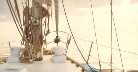 White yacht sailing in a still water at sunset. A view from the deck to the bow, mast, sails. Stunning cloudscape. Reflections on water. Baltic sea. Lifestyle, cruise, regatta, sport, recreation