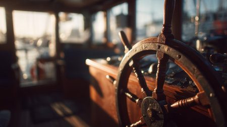 A detailed wooden steering wheel on a boat, illuminated by golden hour sunlight, captures the essence of maritime adventure and tranquility in a serene harbor setting.