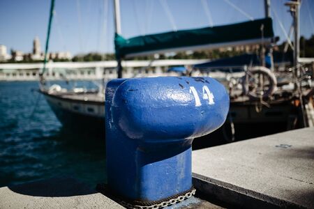Rope on a yacht. Yacht rope cleat and sunlight. Sailboat winch and rope yacht detail. Yachting.