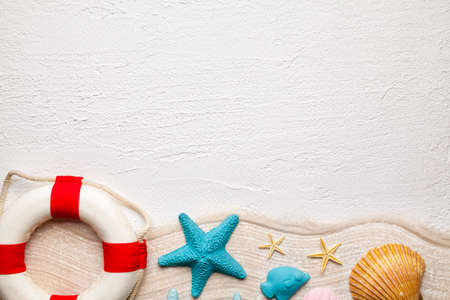 Blank paper sheet, lifebuoy and various starfish on beach sand background