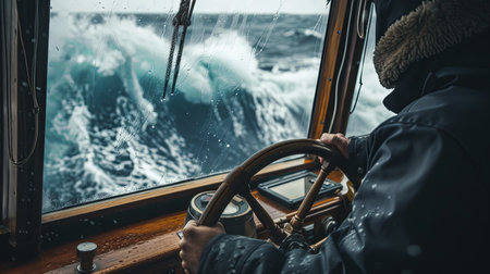 Skipper on deck driving boat steering ship in rough seas with huge waves during storm.
