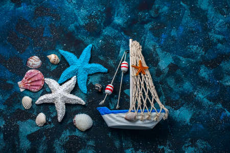 Sea composition with a boat and seashells on a dark blue background. Selective focus