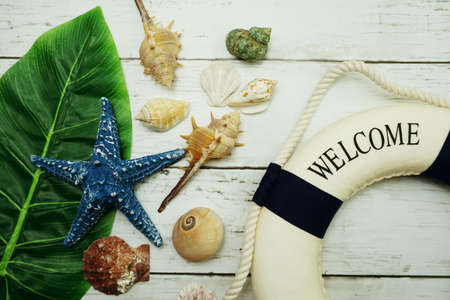 Summer concept with green leave, starfish and lifebuoy decoration on wooden background