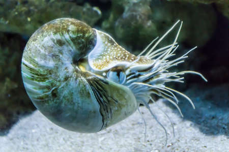 Nautilus shell swimming in acuarius. Living fossil