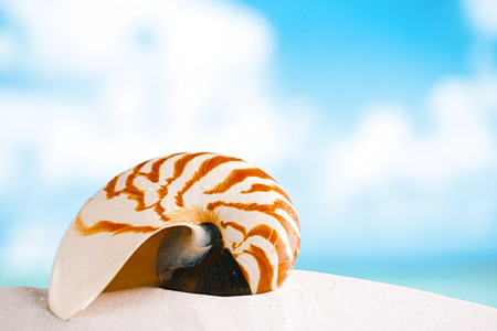 nautilus shell on white beach sand, against sea waves, shallow dof, soft focus