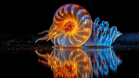 An illuminated nautilus shell and a crystal sculpture are featured against a stark black backdrop. The nautilus exhibits vibrant orange and yellow hues, while the adjacent object glows with cool blue tones. This high-contrast composition uses dramatic lighting, creating an artistic display suitable for various commercial or editorial applications.