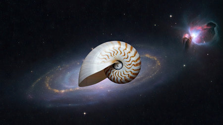 A close-up view of a nautilus shell against a backdrop of space and stars. The shell features a spiral pattern with beige and white tones, while the cosmic background presents hues of purple and blue. The composition, lit with soft lighting, may be suitable for scientific, educational, or creative projects.