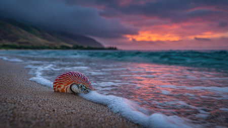 Vibrant seashell rests on the shoreline at the edge of foamy waves during sunset. The colors of the sky and water are beautifully reflected in the water and the scene is peaceful and serene.