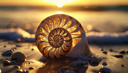 golden sunrise and nautilus shells in the sea