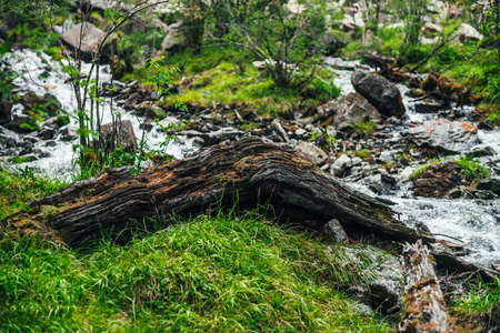 Beautiful mountain creek among rich flora in forest. Atmospheric landscape with mossy log in small river. Fallen tree trunk with moss in cascades of mountain creek. Fast stream with mosses in woods.