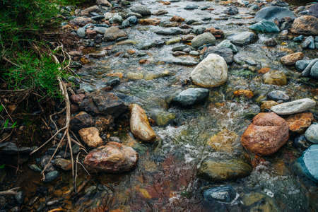 Scenic landscape with awesome motley small river. Picturesque view to beautiful mountain creek with multicolor clay on bottom. Amazing vivid scenery with mountain stream. Nature background with brook.