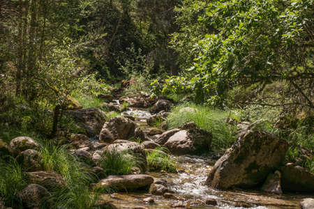 calm stream with many stones on the path, surrounded by much green forest in catalonia, spain