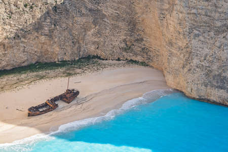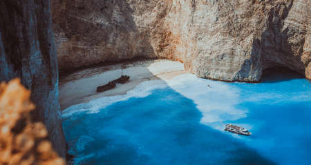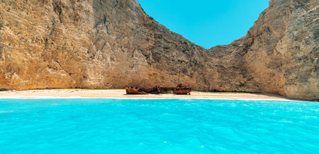 Famous shipwreck on Navagio beach. Blue sea cove surrounded by huge white limestone cliffs. Famous landmark location on Zakynthos island, Greece.
