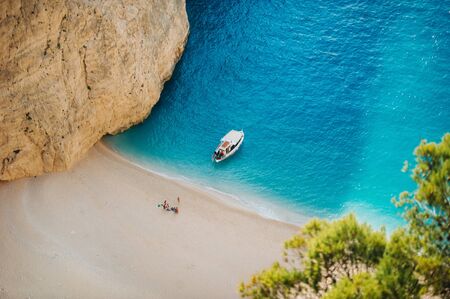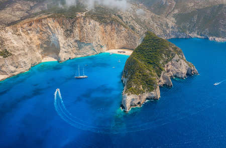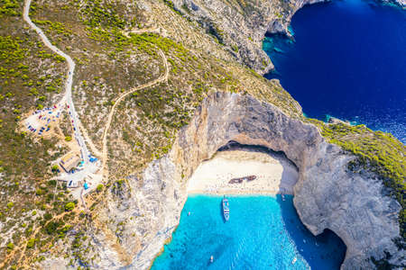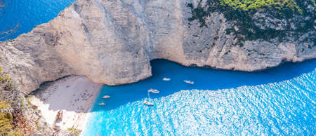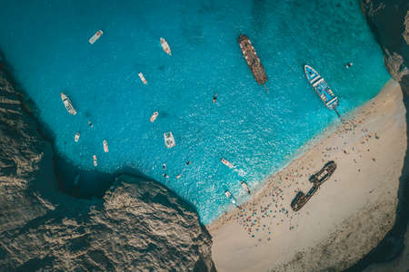 Aerial view of Navagio or Shipwreck Beach on Zakynthos Island, Greece. Summer vacation travel concept