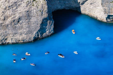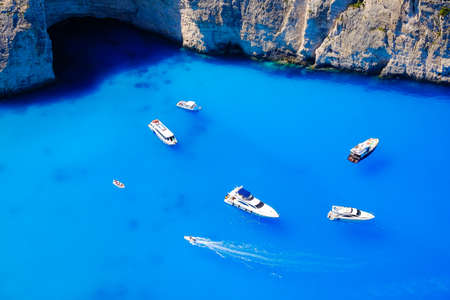Boats anchored at sea in Greece near Zakynthos Island, Navagio Bay.Shipwreck daily tours.