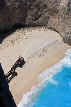 Wreck of a smugglers ship on the beach at the bottom of the stunning Shipwreck Cove, Zante Island, Greece