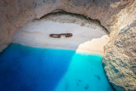 Navagio Beach - Shipwreck Beach, Zakynthos Island, Greece. Aerial view of the most beautiful beach in Zakynthos island - Navagio with shipwreck, Greece, Ionian islands