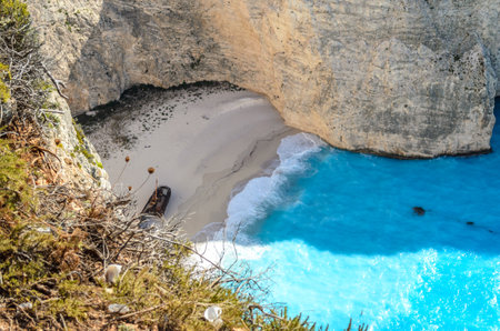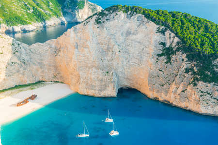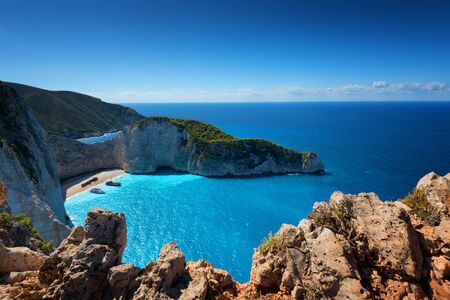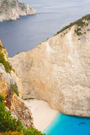 Picturesque Navagio sandy beach with famous shipwreck. It is situated on west coast of Zakynthos island, Greece.
