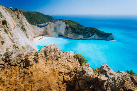 Rock Cliffs in front of Navagio beach Zakynthos. Shipwreck bay with turquoise water and white sand beach. Famous marvel landmark location in Greece