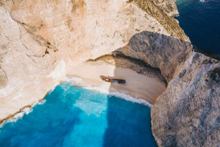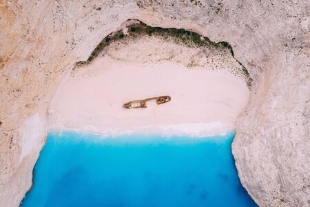 Aerial view of Shipwreck in epic Navagio beach bay on Zakynthos Island, Greece. Summer vacation travel concept
