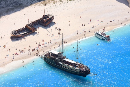 Zakynthos, Greece - June 01: Tourists at the Navagio Beach in Zakynthos, Greece on June 01, 2014. Navagio Beach is most popular attraction among tourists visiting the island of Zakynthos.