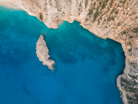 Top view of the beach and two white limestone cliffs of Misithres, Zakynthos island, Greece