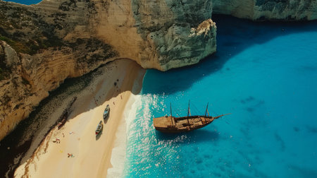 Aerial view of Navagio beach on Zakynthos island, Greece. Shipwreck on the beach in Zakynthos island, Greece. Shipwreck Beach or Agios Georgios. is exposed cove in the Ionian Islands of Greece.