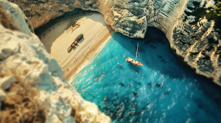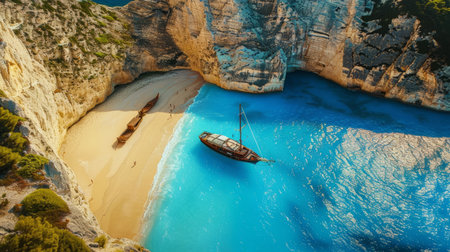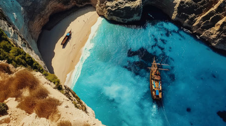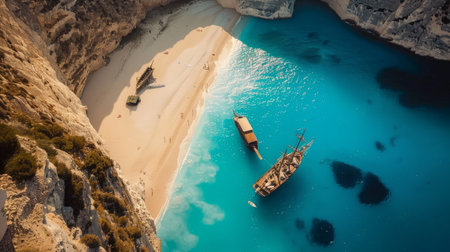 A boats in the lagoon near Navagio Beach, Zakynthos Island, Greece. View of the sea bay and a boats from a drone. Blue sea water. Vacation and travel. Summer landscape from the air.