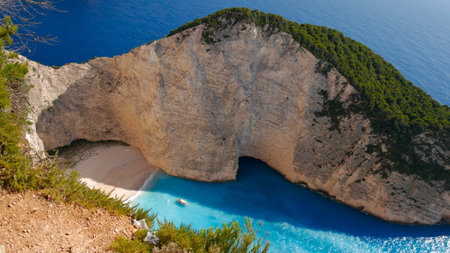 Navagio beach from top at Zakynthos island, Greece. Stranded shipwreck in unique beautiful blue bay surrounded by limestone mountain walls