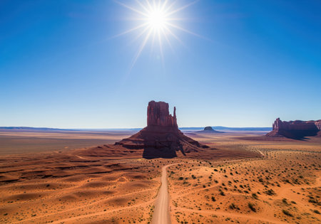 Iconic sandstone butte formations rising from the vast, arid desert floor of monument valley, arizona. a dirt road leads toward the central mesa under a brilliant, sunny blue sky.