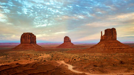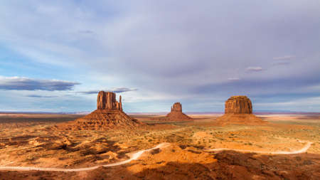 View of the Monument Valley Navajo Tribal Park before sunset with the Eagle Mesa, the Saddlerock, the Stagecoach and the Big Indian buttes in the background, Utah.