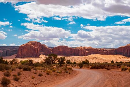 Dirt Road in a Desert Rocky Mountain American Landscape. Morning Sunny Sunrise Sky. Oljato-Monument Valley, Utah, United States. Nature Background
