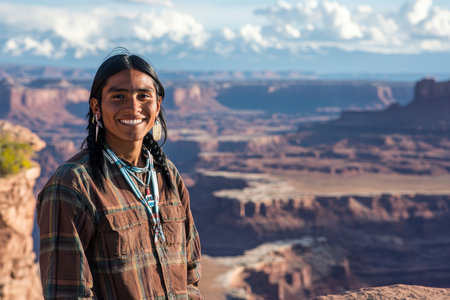 smiling happy young man standing on cliff with landscape behind him. Native American heritage day