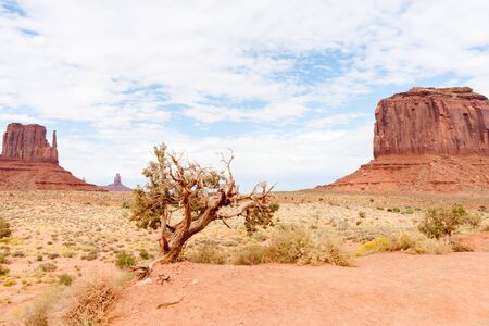 Twisted tree with outstanding red rock buttes of Monument Valley.