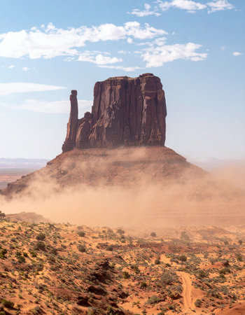A powerful gust of wind kicks up a cloud of red dust around the base of the iconic Mitten Butte in Monument Valley.