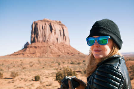 Tourist woman girl hiker watching beautiful scenery in Monument valley, Utah, USA. Immensity landscape