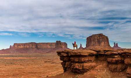 an Indian on a horse in front of a red rock formations in Monument Valley, USA