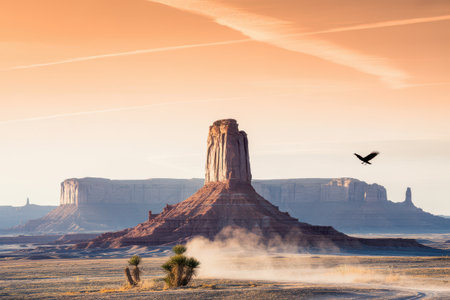 This stunning landscape captures the iconic beauty of Monument Valley in Arizona USA The distinctive sandstone buttes rise majestically from the desert floor bathed in the warm glow of a scenic sunrise An eagle soars through the vast sky adding a touch of freedom and wildness to the scene The image showcases the natural wonder and serene atmosphere of this iconic American landscape It is perfect for conveying themes of travel adventure the American West and the beauty of nature This picture highlights nature at its finest